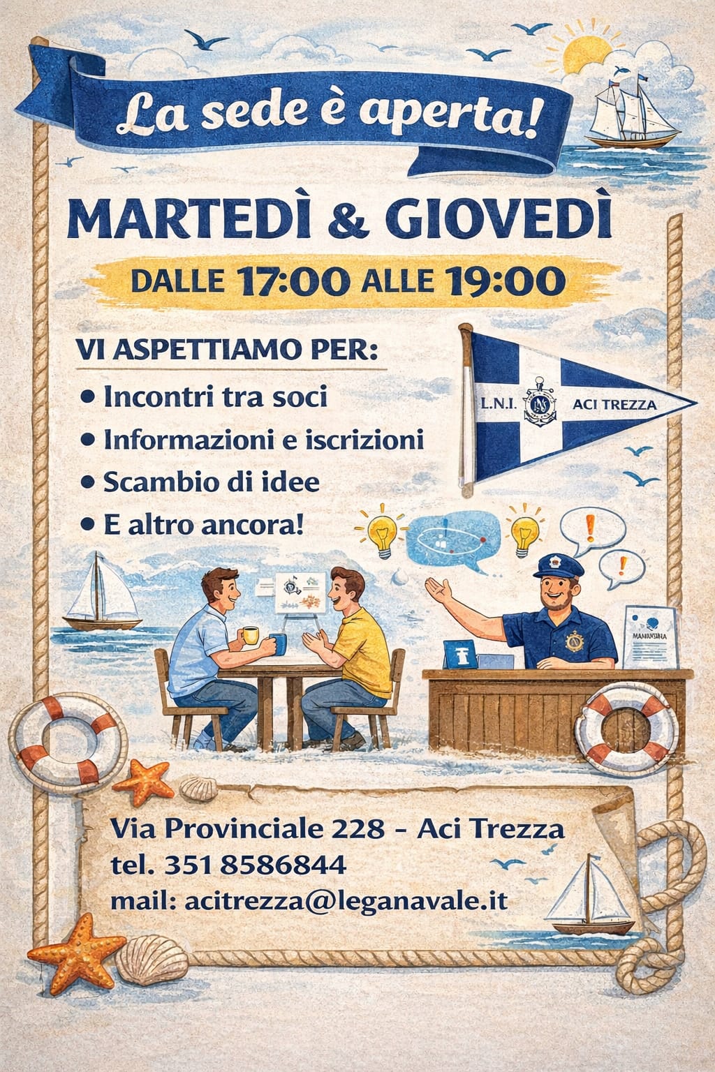 - Opportunità culturali di crescita e di socializzazione: potrai partecipare a corsi, iniziative e attività formative e culturali che mettono al centro il mare e la marittimità; inoltre, i soci possono abbonarsi alla rivista Lega Navale, il più antico periodico marittimo in ambito civile.