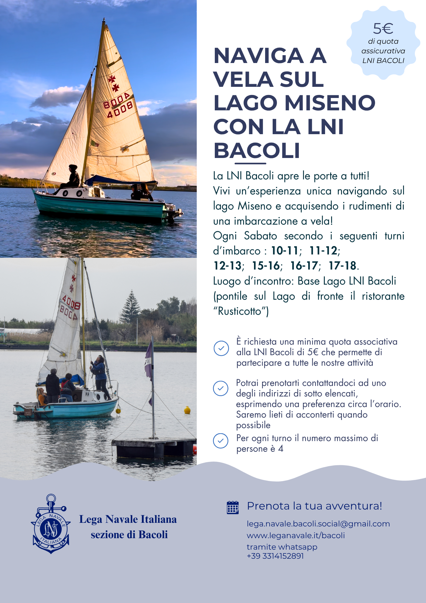 Se hai sempre sognato di navigare a vela, questa è l’occasione perfetta! Ogni sabato puoi salire a bordo e imparare i rudimenti della vela con la Lega Navale Italiana – Sezione di Bacoli.