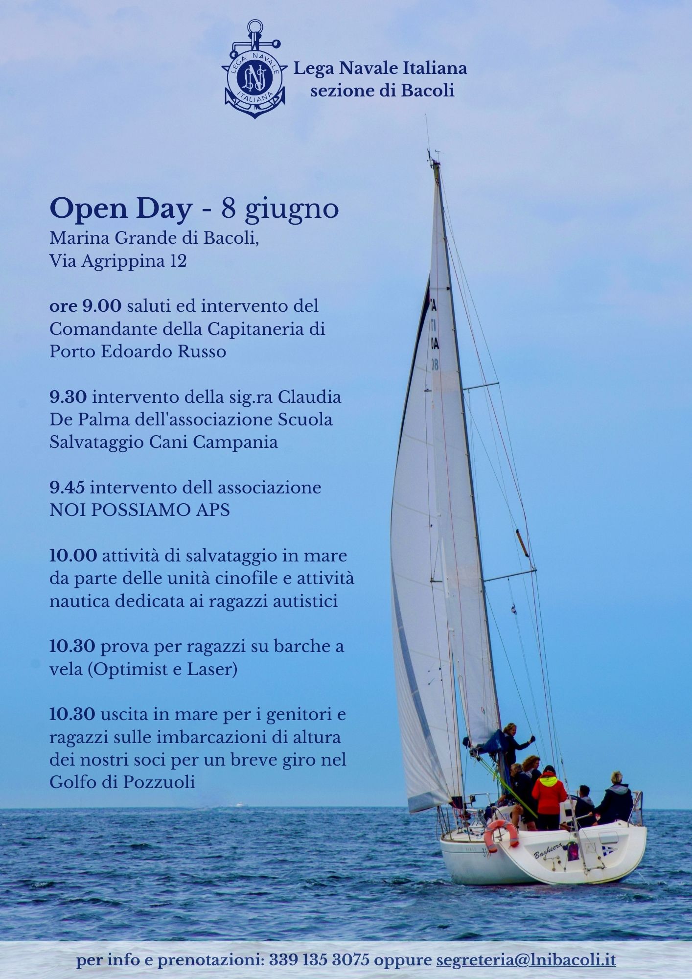 Sabato 8 giugno 2024 presso la Lega Navale Italiana di Bacoli si terrà l’Open Day.