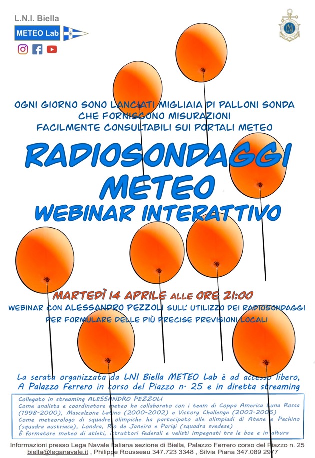Unisciti a noi per un incontro speciale targato LNI Biella METEO Lab, dedicato ai radiosondaggi e alla piattaforma Windy. Insieme ad Alessandro Pezzoli, analista, formatore velico e coordinatore meteo, impareremo passo per passo ad utilizzare ed interpretare i radiosondaggi su Windy per migliorare la nostra comprensione del tempo che farà.