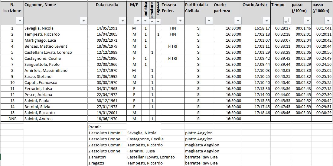 Tra le donne prima e' risultata Cecilia Castagnone, 26 anni, triatleta FITRI, new entry della Caprajalonga, con 39 min e 42 sec. Tra gli amatori primo e' risultato Lorenzo Castellani Lovati, 32 anni, anche lui alla prima partecipazione alla manifestazione. Il primo della categoria ragazzi, Riccardo Tempesti.