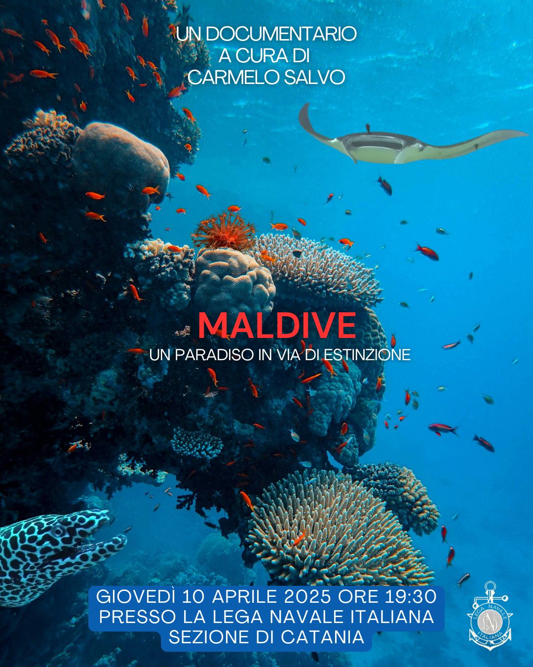 Giovedì 10 aprile alle ore 19:30 presso la nostra sede sociale verrà proiettato un emozionante documentario realizzato dal nostro socio Salvo Carmelo. Attraverso immagini spettacolari e riprese subacquee mozzafiato, esploreremo la vibrante vita dei pesci tropicali, la delicata bellezza delle piante marine e l'unicità dell'ecosistema maldiviano. Un'occasione imperdibile per ammirare questo paradiso terrestre e riflettere sull'urgente necessità di proteggerlo dalle minacce dei cambiamenti climatici e dell'attività umana. Vi aspettiamo numerosi!