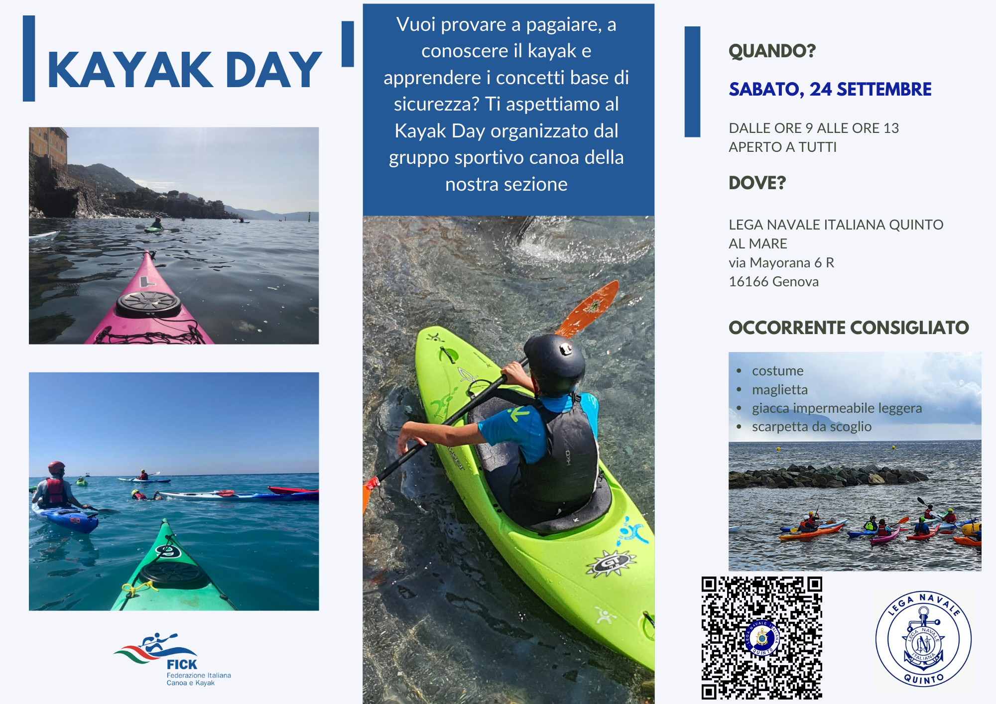 La Lega Navale Italiana Genova Quinto, invita tutti i cittadini e i soci a partecipare al Kayak Day.