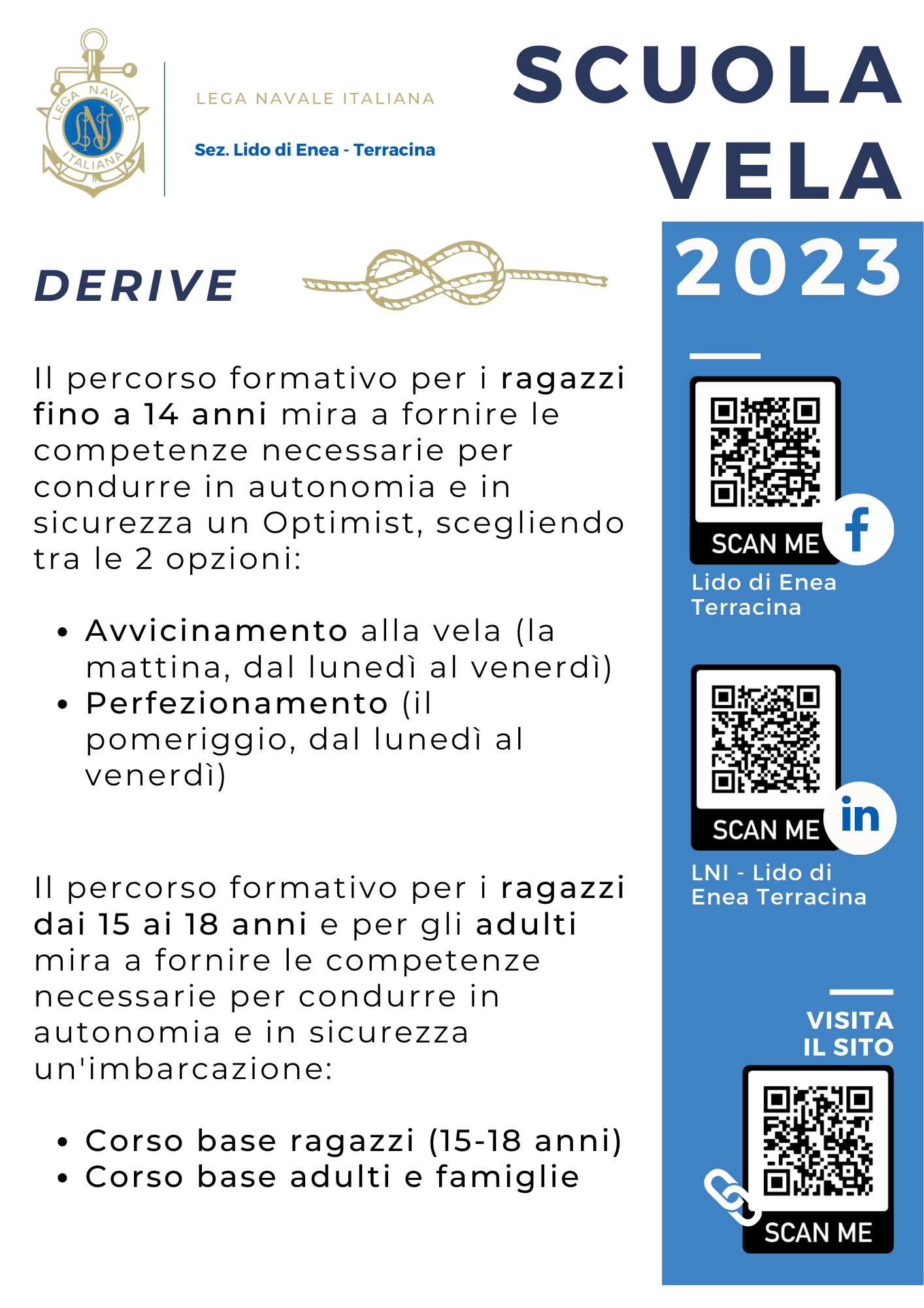 Il percorso formativo per i ragazzi fino a 18 anni e per gli adulti mira a fornire le competenze necessarie per condurre in autonomia e in sicurezza un'imbarcazione: