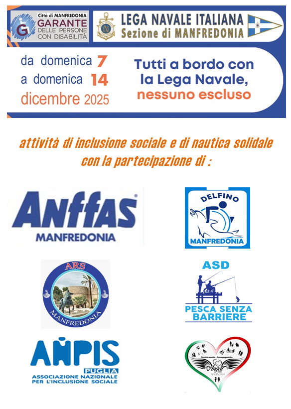 Nella settimana che va, da domenica 7, a domenica 14 dicembre 2025, i soci della Lega Navale di Manfredonia, volontariamente e gratuitamente, metteranno a disposizione le loro barche per delle brevi uscite in mare con delle persone affette da disabilità.