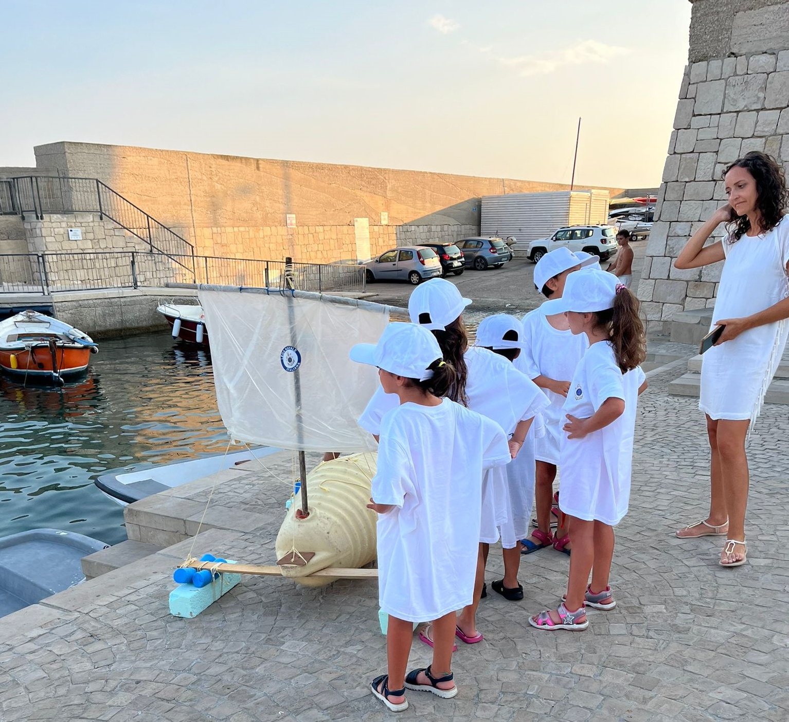 Grazie al ritrovamento di una grande boa e con l’aggiunta degli altri materiali raccolti, il “trimarano a vela quadra” ha preso il mare con successo, spinto da un vento leggero, con la gioia dei bambini che hanno visto la realizzazione del loro impegno.