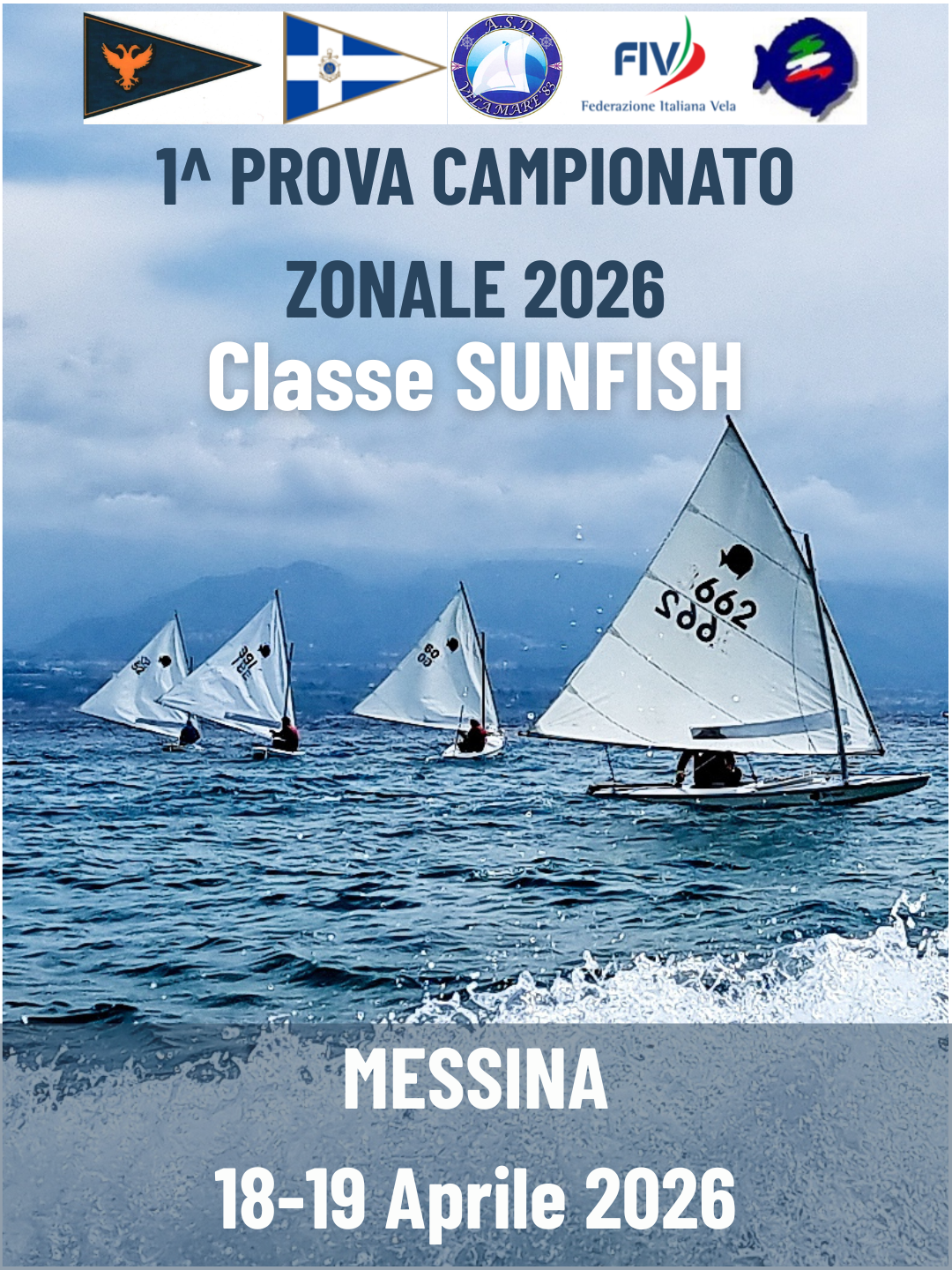 La Federazione Italiana Vela congiuntamente agli affiliati Lega Navale Italiana - Sez. di Messina, Circolo del Tennis e della Vela di Messina e Vela Mare ’83 di Briga Marina (Me), comunicano il Bando della 1^ prova del Campionato Zonale classe SUNFISH che si svolgerà a Messina nelle date del 18 e 19 Aprile 2026.