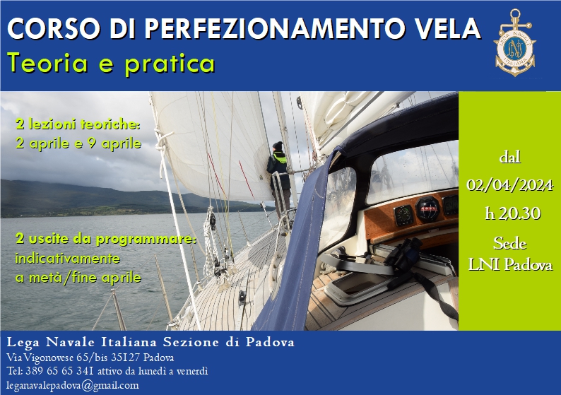 n. 2 lezioni teoriche da svolgersi in sede Lega Navale di Padova Via Vigonovese, 65 - dalle 20.30 alle 22.30 (martedì 02.04.2024 e martedì 09.04.2024) , dove verranno trattati seguenti argomenti :