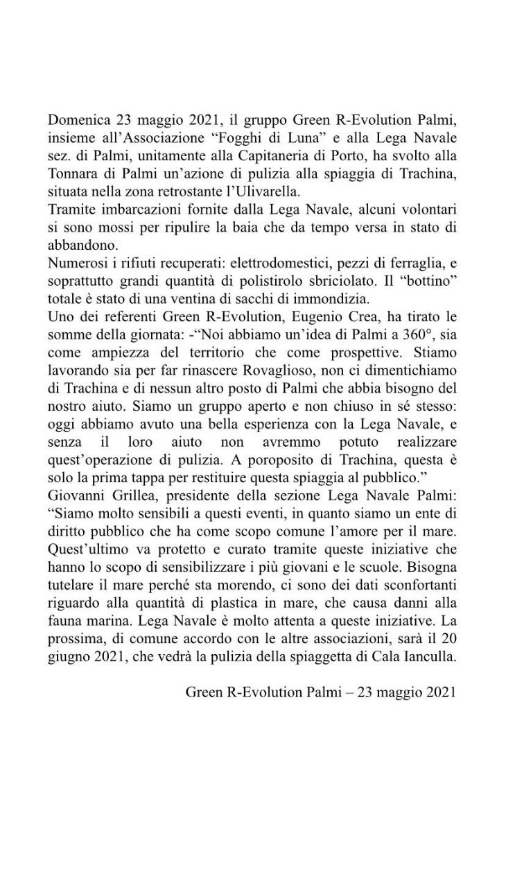 Uno dei referenti di Green R-Evolution, ha tirato le somme della giornata: " Oggi abbiamo avuto una bella esperienza con la Lega Navale, senza il loro aiuto non avremmo potuto realizzare quest'operazione di pulizia. A proposito di Trachina, questa è solo la prima tappa per restituire questa spiaggia al pubblico"