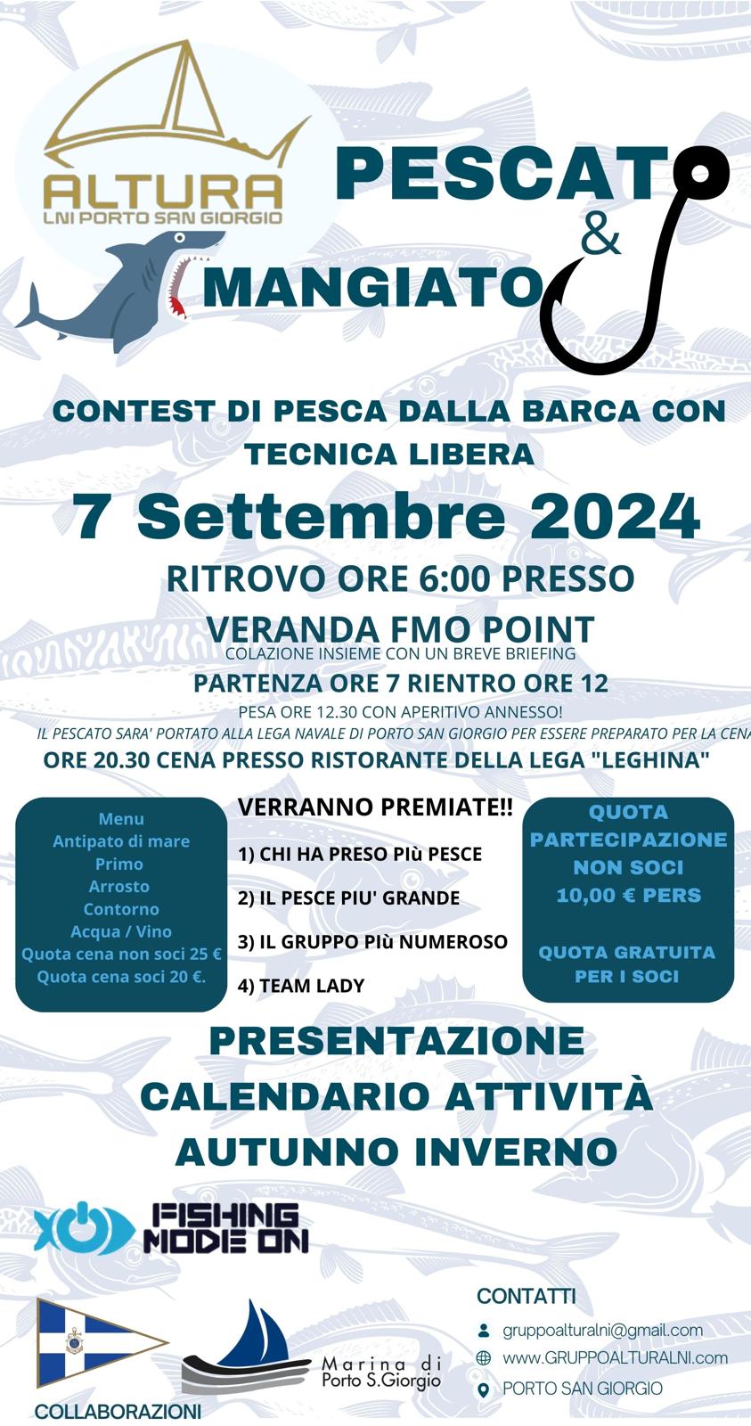 vi informiamo che sabato 7 settembre si svolgerà l'evento "Pescato e Mangiato". Ricordiamo che la manifestazione è per tutti i mezzi (anche a vela), con tecnica di pesca libera. Obiettivo divertirsi e stare insieme.