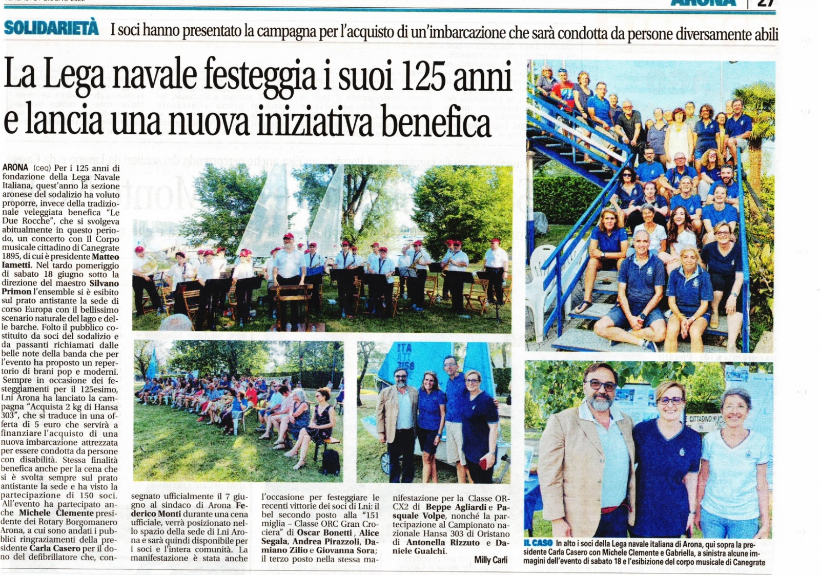 Nel 2022 la Sezione di Arona è stata partner operativo del progetto “CON-TATTO Vela”. Patrocinato dalla Presidenza Nazionale della Lega Navale Italiana, il progetto nasce da una iniziativa del Rotary International Distretto 2031 (Piemonte Nord Ovest e Valle d’Aosta) con la ASL 1 Città di Torino per realizzare un percorso scientifico, abilitativo e sportivo destinato a 12 ragazzi con disturbo dello spettro dell’autistico (ASD) a bordo delle barche dei soci LNI. Progetto che, dal Lago Maggiore, si è concluso con una settimana di navigazione nel mare della Liguria. “Un’esperienza da cui ne sono usciti arricchiti i nostri istruttori e armatori. Abbiamo avuto la soddisfazione di riuscire a portare questi straordinari ragazzi per una settimana in barca e hanno vissuto insieme agli altri membri dell’equipaggio un’esperienza unica”, dice Carla Casero. A settembre dello stesso anno si è tenuto alla Lega Navale di Arona il “Campus di vela CIP-INAIL”. Un percorso articolato in sessioni teoriche in aula e uscite in barca per la diffusione della cultura dello sport e l’avviamento alla pratica sportiva di 8 persone con disabilità da lavoro assistite INAIL e per i loro accompagnatori. “Dopo la pandemia le attività sono riprese appieno e siamo stati coinvolti in diversi progetti con associazioni che seguono le persone con diverse tipologie di disabilità”, continua la Delegata Regionale. “Ci siamo trovati a questo punto con la necessità di avere più di una Hansa. Lanciammo allora una campagna di raccolta fondi per sostenere le spese per l’acquisto di una seconda Hansa, ‘Acquista 2 Kg di HANSA 303’m attivata in occasione del concerto di beneficienza che organizzammo per celebrare i 125 anni della Lega Navale Italiana. Abbiamo raggiunto l’obiettivo, grazie a donatori privati, al supporto della Presidenza Nazionale e del Comune di Arona e siamo riusciti ad acquistare una seconda Hansa”.