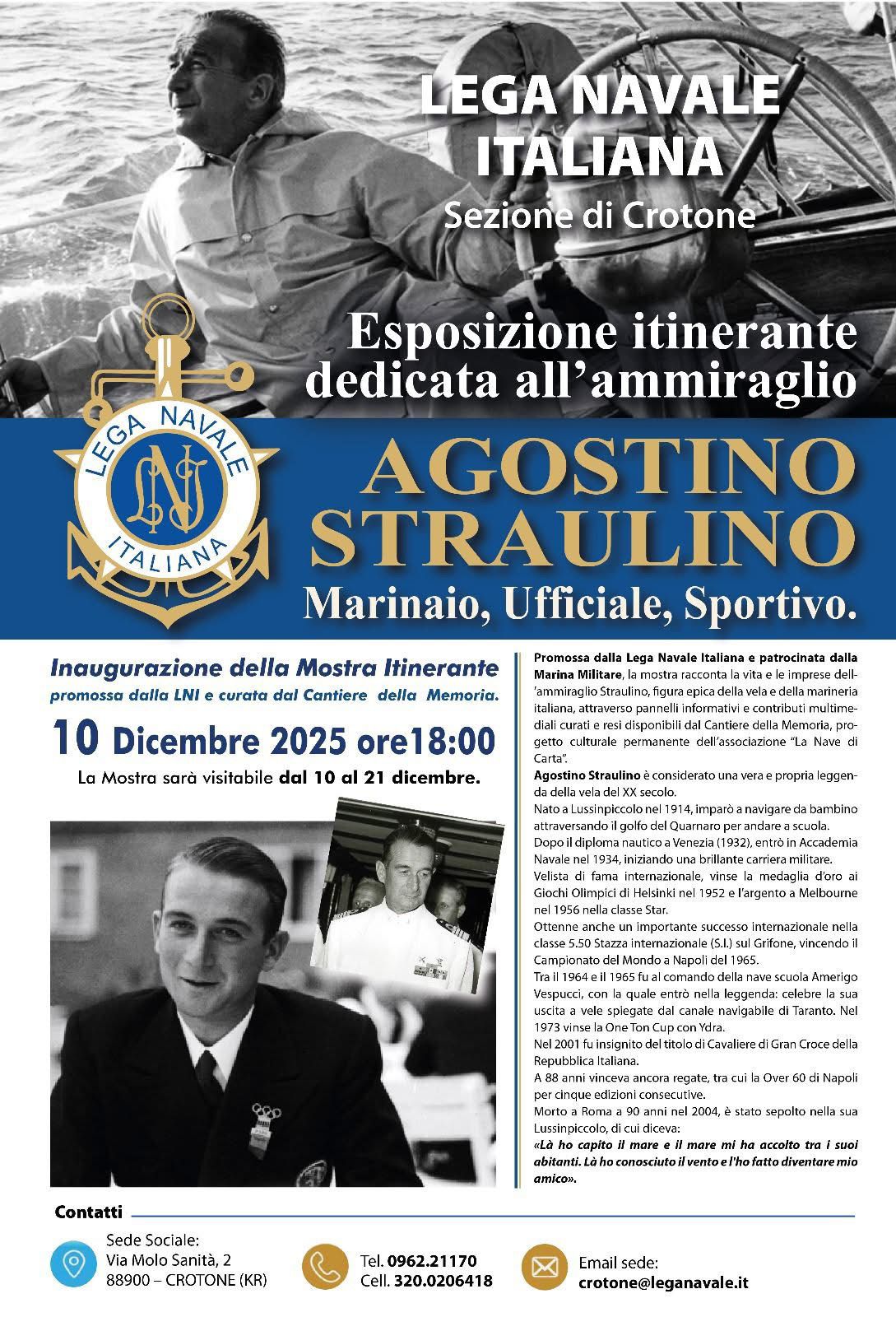 La mostra itinerante “Agostino Straulino. Marinaio, ufficiale, sportivo” approda alla Lega Navale di Crotone dal 10 al 21 dicembre.