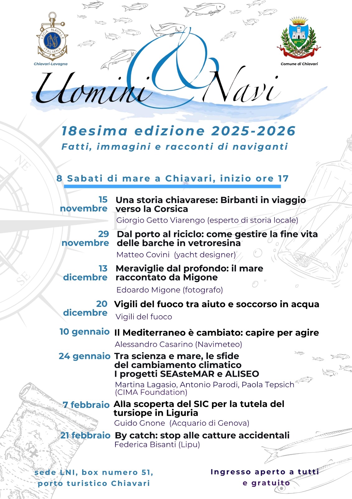 Con il nuovo anno ripartono gli incontri “Uomini e Navi”, la rassegna culturale curata dalla Lega Navale Italiana Sezione Chiavari-Lavagna, con il patrocinio del Comune di Chiavari. Sabato 10 gennaio alle ore 17, nel box numero 51 al porto turistico di Chiavari protagonista sarà Alessandro Casarino (Navimeteo) con l’incontro “Il Mediterraneo è cambiato: capire per agire”. Come sempre l'ingresso è libero e aperto a tutti.