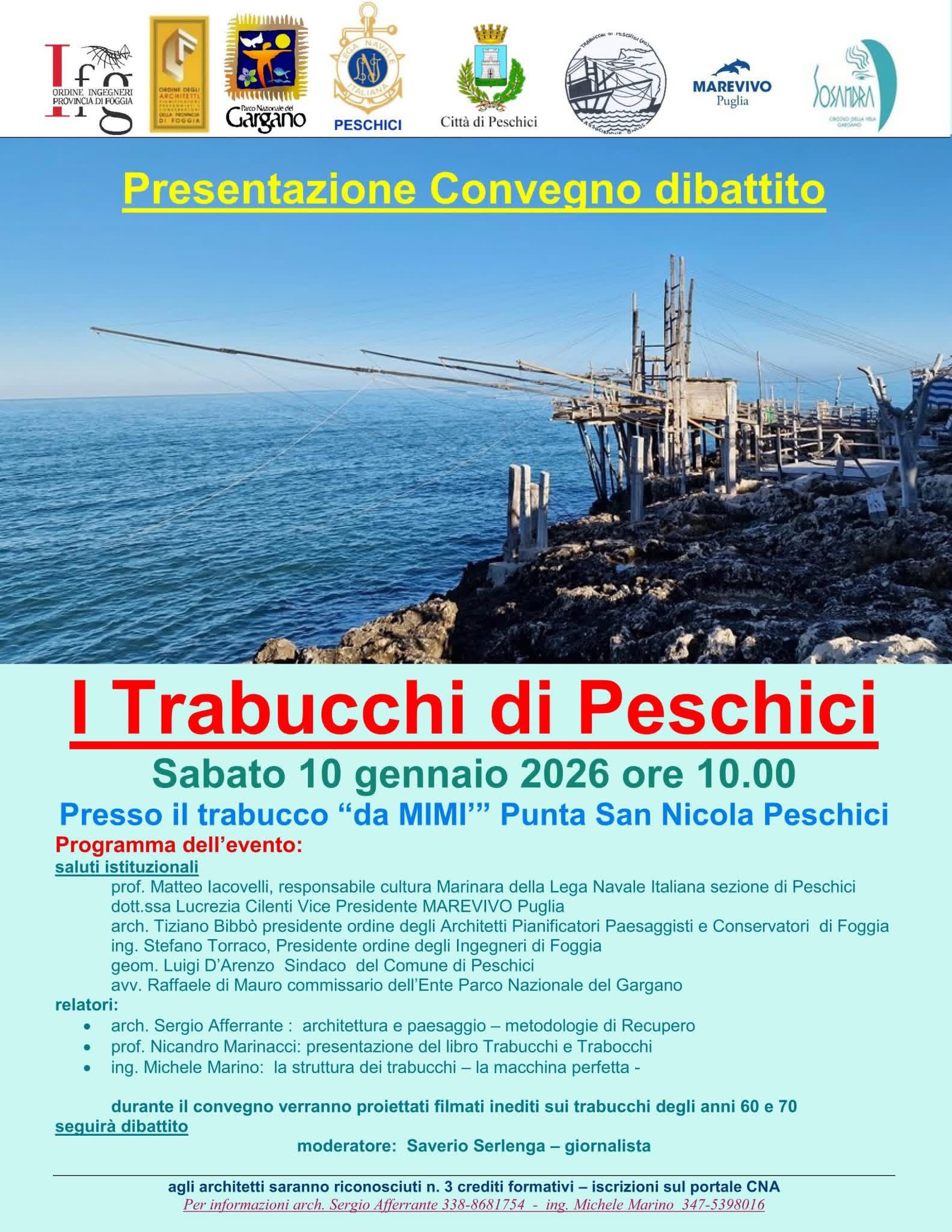 Sabato 10 gennaio, presso la Sezione della Lega Navale Italiana di Peschici, si terrà un convegno dedicato ai trabucchi, testimonianze della cultura marinara del Gargano. L’incontro offrirà un’importante occasione di confronto sui temi della cultura del mare, del paesaggio costiero, dei beni culturali e delle antiche tradizioni marinare che da secoli caratterizzano la storia e l’identità delle comunità garganiche.