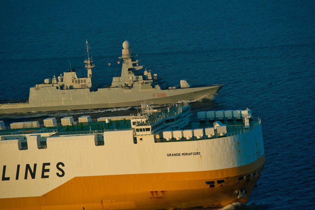 La fregata italiana classe Bergamini Federico Martinengo scorta la nave cargo italiana Grande Mirafiori nel Mar Rosso