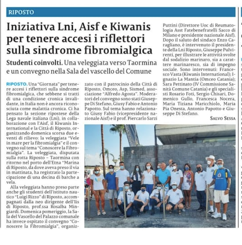 Si è conclusa la giornata di sensibilizzazione sulla fibromialgia, organizzata dal segretario della Sezione LNI di Riposto, Dott. Antonino Papotto, in collaborazione con l’AIFS ODV ed il Kiwanis Distretto Italia S. Marino e la Divisione 2 Etna Patrimonio dell’Umanità, con il patrocinio del Comune di Riposto.