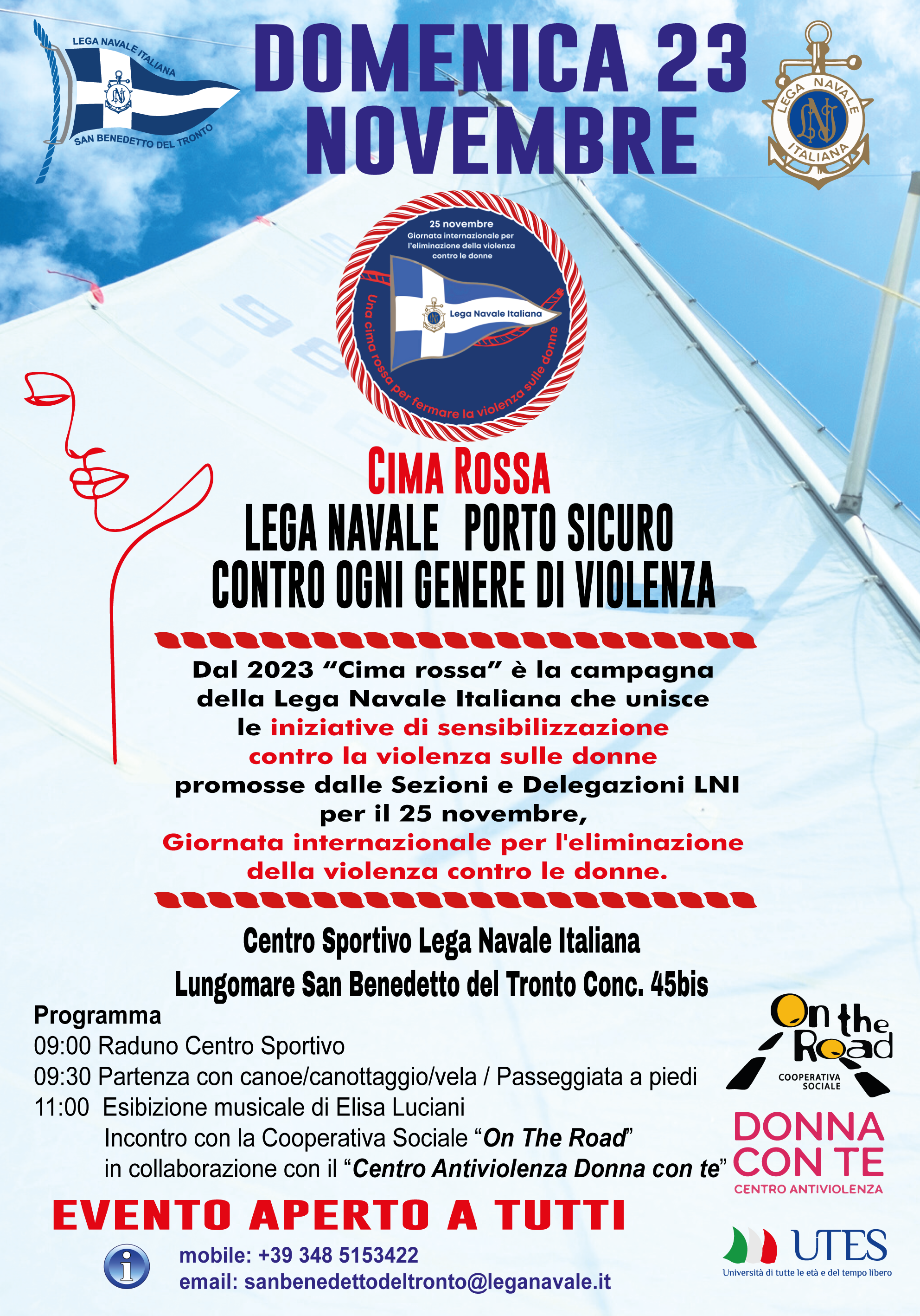 Dal 2023 “Cima rossa” è la campagna della Lega Navale Italiana che unisce le iniziative di sensibilizzazione contro la violenza sulle donne promosse dalle Sezioni e Delegazioni LNIper il 25 novembre, Giornata internazionale per l’eliminazione della violenza contro le donne.