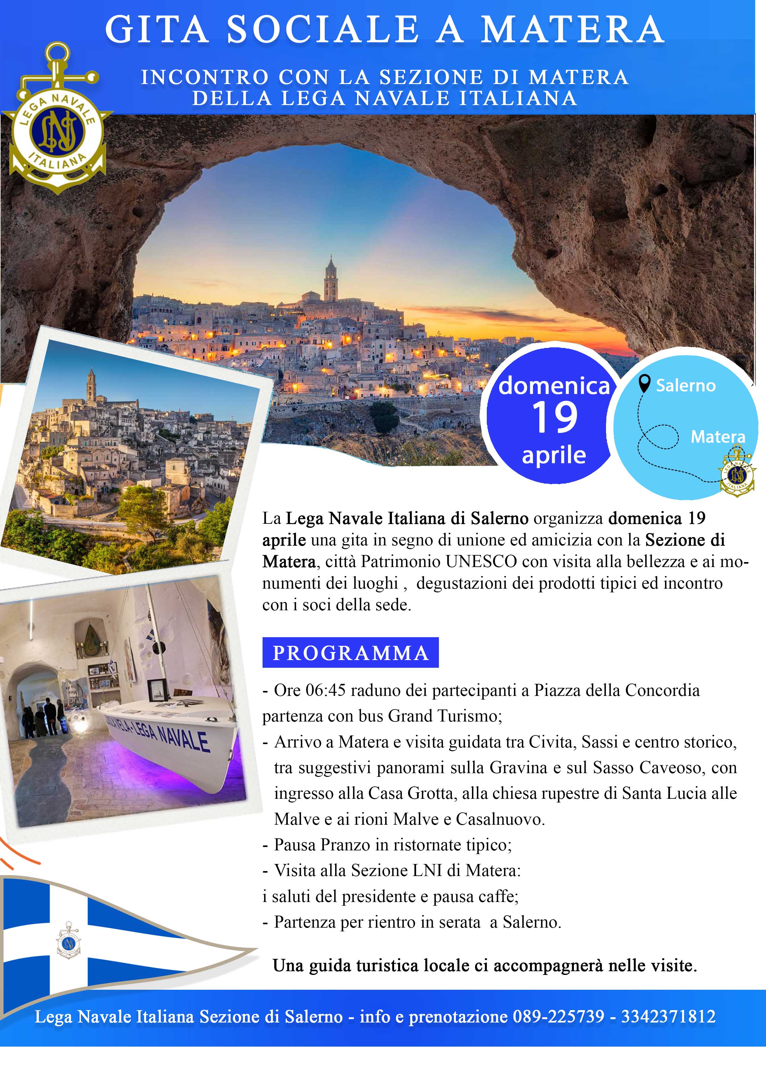 La nostra Sezione della Lega Navale Italiana di Salerno, organizza, domenica 19 aprile 2026, una gita sociale in segno di unione e amicizia con la Sezione della Lega Navale Italiana di Matera, situata all’interno di un suggestivo complesso ipogeo nei rioni Sassi, in via Fiorentini, una sede unica definita “un porto nella roccia”.