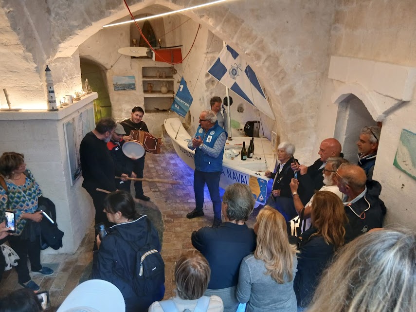 Nel pomeriggio si è svolto uno dei momenti più significativi della giornata: la visita alla sede della Lega Navale di Matera. L’arrivo è stato reso ancora più coinvolgente da una calorosa accoglienza accompagnata dai suoni della tradizione locale, che hanno creato un’atmosfera festosa e identitaria. Durante l’incontro, i soci della sezione materana hanno accompagnato gli ospiti alla scoperta della sede e delle attività associative, offrendo un’interessante spiegazione sul profondo legame tra Matera e l’acqua: un rapporto antico, basato su ingegnosi sistemi di raccolta e conservazione idrica, che ha reso possibile la vita nei Sassi nel corso dei secoli. Particolarmente significativo è stato anche il momento di confronto tra le due sezioni, occasione per condividere esperienze, valori e progetti futuri, nel segno di una collaborazione sempre più forte. Come da tradizione, si è poi svolto lo scambio dei gagliardetti, accompagnato dalla consegna del caratteristico “Cuccù” materano, simbolo di buon auspicio. A concludere l’incontro, un conviviale brindisi accompagnato da dolci tipici, che ha suggellato la giornata in un clima di autentica amicizia.Un sentito ringraziamento va al presidente Rocco Petrera e a tutti i Soci della sezione materana per la straordinaria accoglienza, nonché a Marco Pagano per l’eccellente organizzazione.Una giornata intensa e ricca di emozioni, che ha rafforzato il legame tra le due sezioni nel segno della cultura, della tradizione e dello spirito associativo.