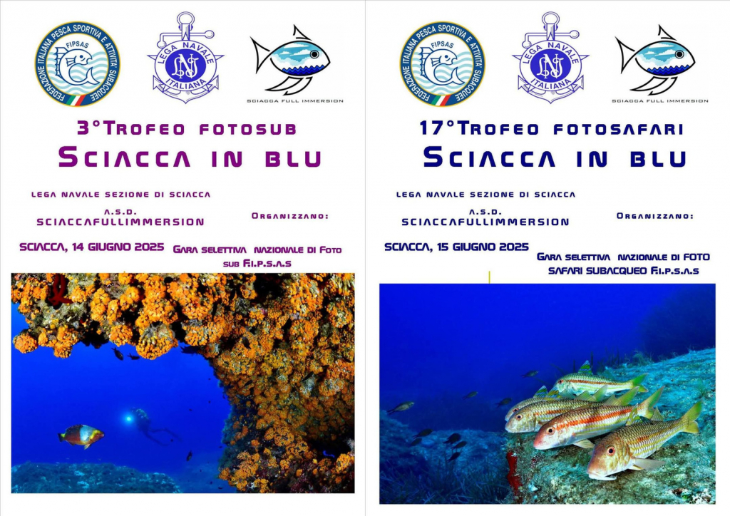 Uno sguardo alle immagini più belle dello "Sciacca in Blu 2025", l’evento che il 14 e 15 giugno ha animato la nostra sezione con due importanti appuntamenti: il 3° Trofeo Fotosub e il 17° Trofeo Fotosafari. Le immersioni lungo la costa di Capo San Marco hanno permesso ai partecipanti di realizzare scatti suggestivi che mettono in luce la straordinaria biodiversità dei nostri fondali marini. Questa galleria raccoglie alcuni dei momenti più significativi, tra sport, passione per il mare e sensibilità ambientale.