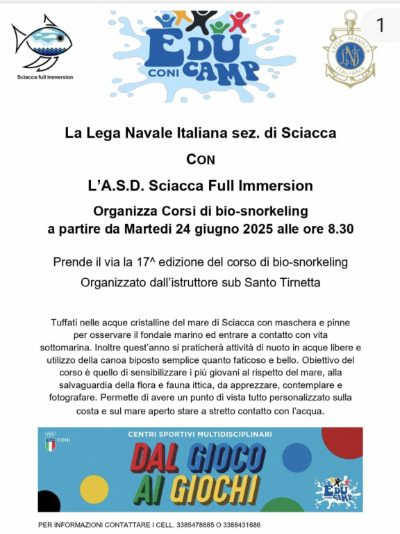 Si è conclusa il 27 agosto 2025 la 17ª edizione del Corso di Bio snorkeling, organizzato dalla Lega Navale Italiana – Sezione di Sciacca in collaborazione con l’ASD Sciacca Full Immersion e guidato dall’istruttore subacqueo Santo Tirnetta. Queste foto raccontano i momenti più belli di un’estate trascorsa tra immersioni nelle acque cristalline di Sciacca, esplorazioni del fondale marino, attività di nuoto in acqua libera e uscite in canoa biposto. Un percorso che ha unito sport, divertimento ed educazione ambientale, con l’obiettivo di avvicinare i più giovani al mare, alla sua conoscenza e alla sua tutela.