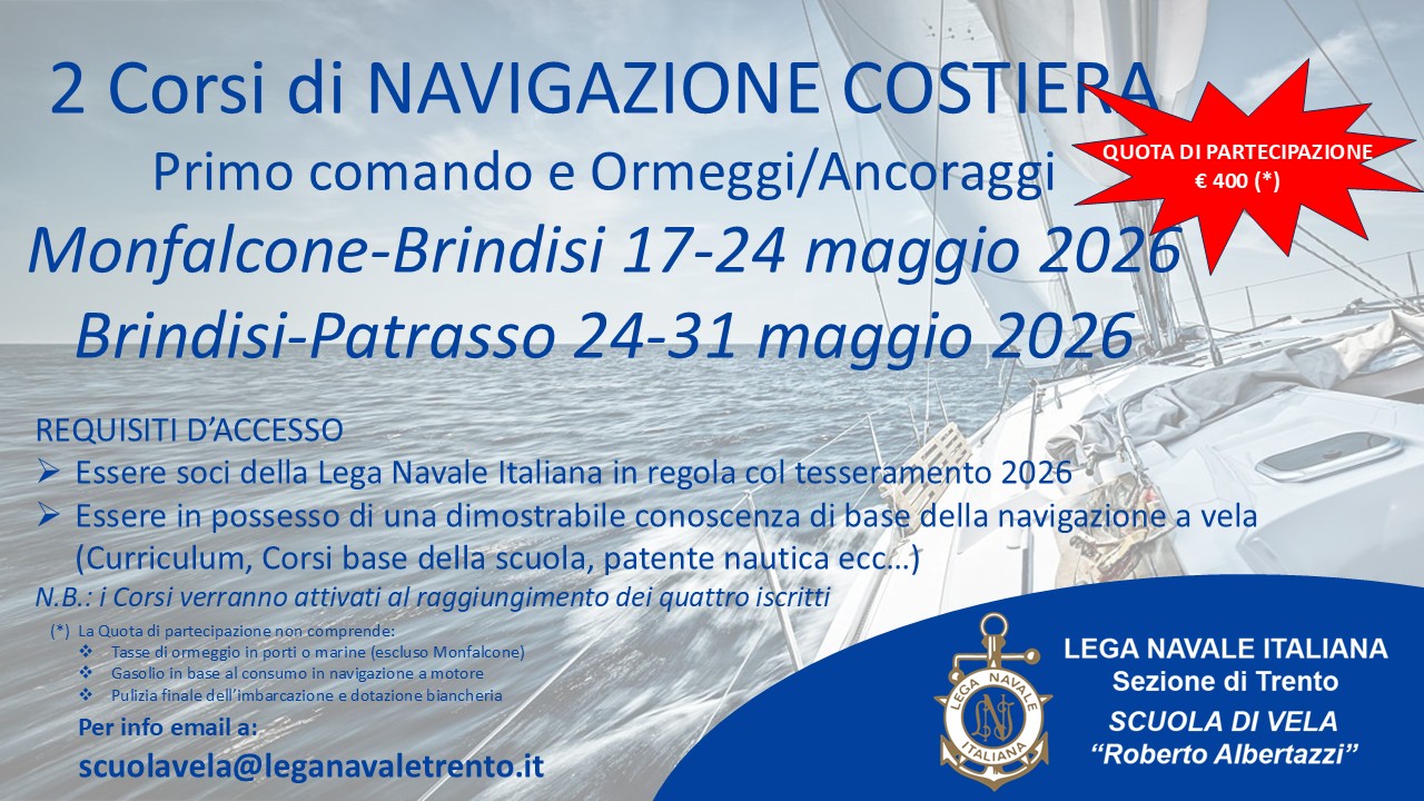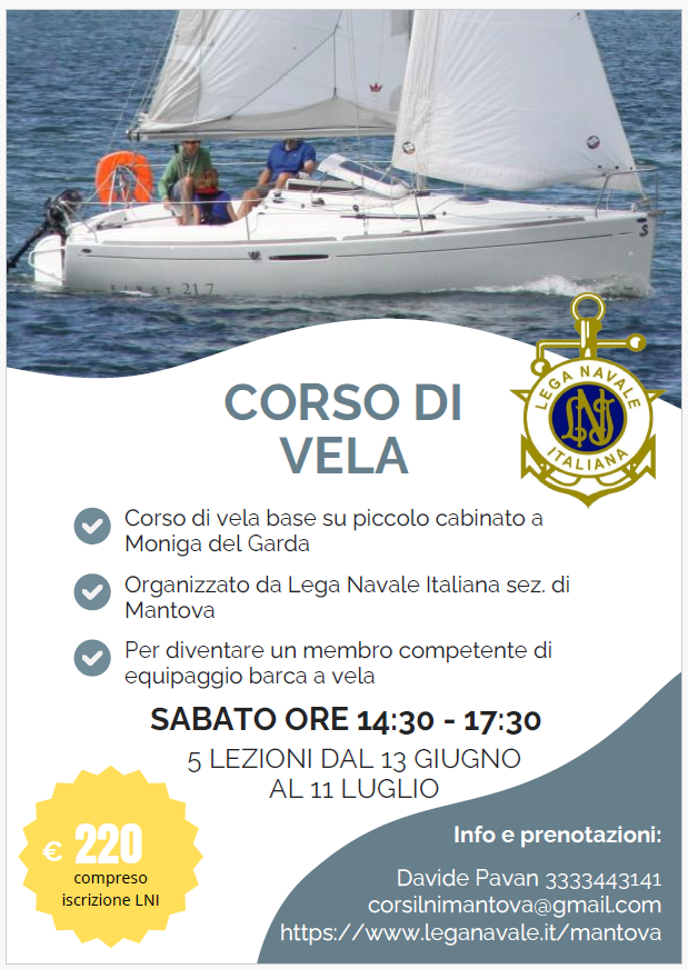 Il nostro istruttore LNI Davide Pavan organizza Corso di Vela base su piccolo cabinato a Moniga del Garda. I corsi si svogleranno il Sabato dalle 14:30 alle 17:30 per una durata di 5 lezioni. Info e prenotazioni...