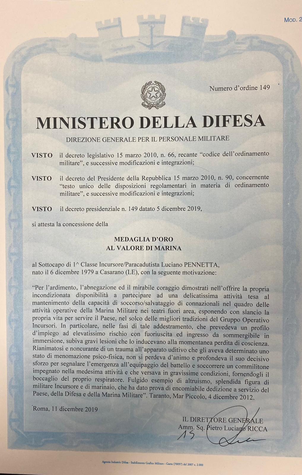 Il 3 dicembre 2020, presso la storica Biblioteca di Palazzo Marina a Roma, si è svolta la cerimonia di consegna delle onorificenze al personale militare e civile, da parte del Sig. Capo di Stato Maggiore della Marina, Ammiraglio di Squadra Giuseppe Cavo Dragone. Nell'occasione è stata consegnata al nostro Socio, Luciano PENNETTA, all'epoca dei fatti Sottocapo di 1^ Classe Incursore Paracadutista, la Medaglia d'Oro al Valor di Marina. L'Onorificenza - destinata a premiare atti di coraggio diretti a salvare vite umane in mare - è stata conferita al Sottocapo Luciano Pennetta per aver soccorso un commilitone in difficoltà durante un'esercitazione subacquea, nonostante egli stesso avesse subito gravi lesioni.