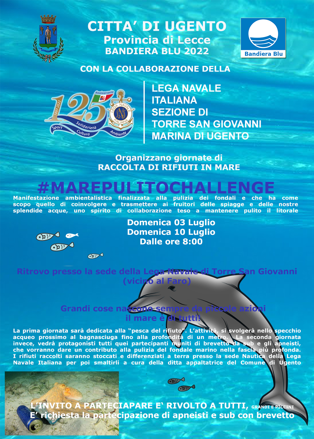 L’iniziativa “Mare Pulito Challenge” con il patrocinio e la collaborazione dall’amministrazione comunale di Ugento, ha come scopo quello di trasmettere ai fruitori delle spiagge e delle nostre splendide acque uno spirito di collaborazione teso a mantenere pulito il litorale, compiendo azioni esemplari di pulizia anche individuale.