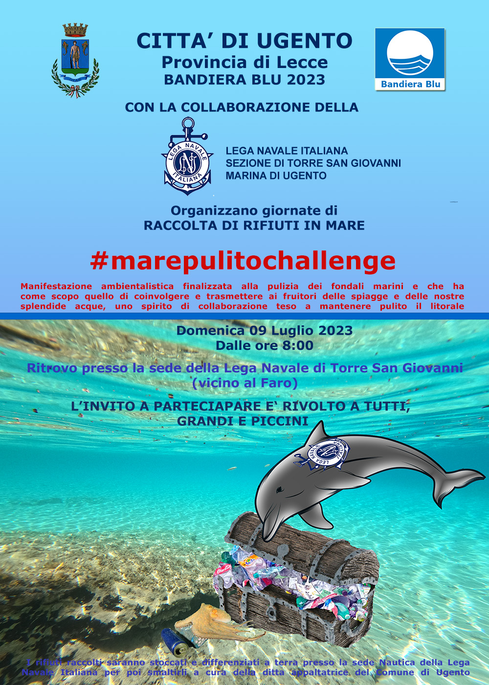 Confermata la BANDIERA BLU 2023 ad Ugento, torna l’iniziativa “#marepulitochallenge”. Evento organizzato dalla Lega Navale Italiana di Torre San Giovanni con la Collaborazione e il Patrocinio del Comune di Ugento, ha lo scopo di trasmettere ai fruitori delle spiagge e delle nostre splendide acque uno spirito di collaborazione teso a mantenere pulito il litorale, compiendo azioni esemplari di pulizia anche individuale.