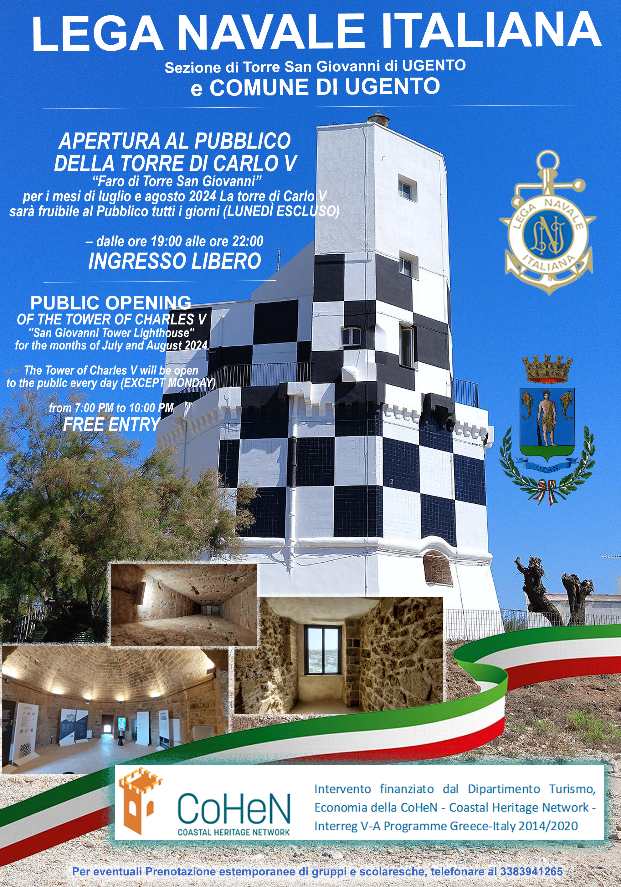 Proseguono con entusiasmo nel contesto del prestigioso progetto di valorizzazione della torre di Carlo V, l'iconico faro di Torre San Giovanni, le attività culturali della locale Sezione della Lega Navale Italiana. Nonostante le visite siano attualmente limitate alla parte antica della torre, costruita durante il regno di Carlo V, continuano a riscuotere notevole interesse tra i residenti e i turisti. Purtroppo, per il momento, in attesa dell'inizio dei lavori del secondo lotto, i piani superiori, inclusi l'appartamento del guardiano e le terrazze, non sono accessibili al pubblico per ovvie ragioni di sicurezza.