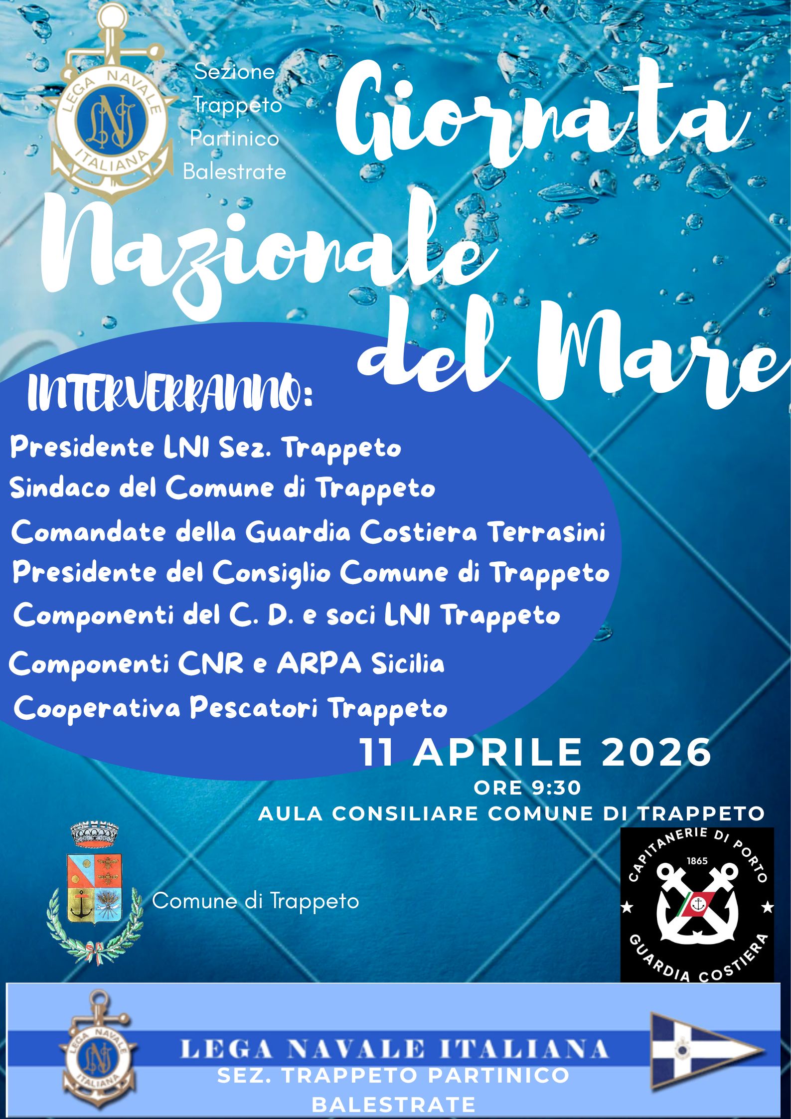 In occasione della Giornata Nazionale del Mare, nel Comune di Trappeto si svolgerà presso l'aula Consiliare una conferenza organizzata dalla Sezione LNI di Trappeto. Saranno presenti varie Autorità di riferimento del territorio.